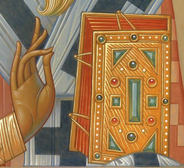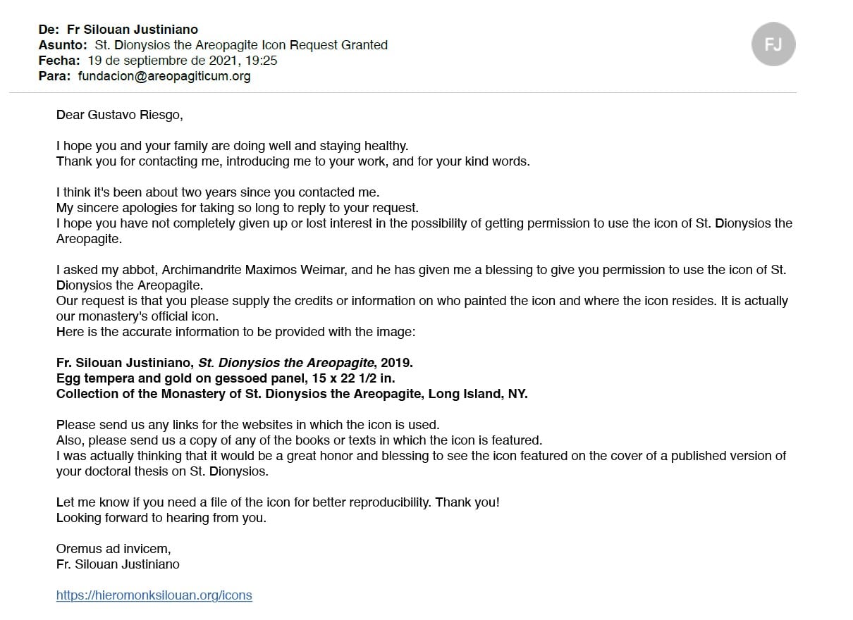 St. Dionysios the Areopagite, by Fr. Silouan Justiniano, 2019. Egg tempera and gold on wood panel, 15 x 22 1/2 in.