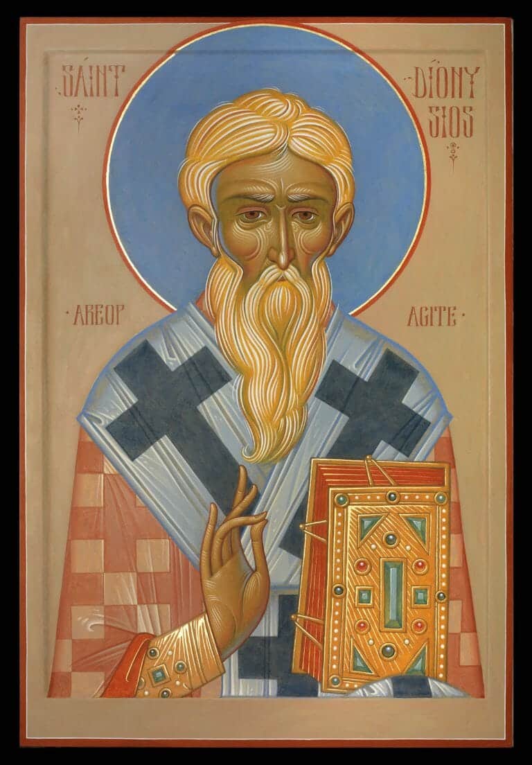 In this new icon, St. Dionysios the Areopagite seems to gently smile as he firmly blesses the viewer. With his blue halo, he seems to be shining “in the brilliant darkness of a hidden silence.”[ii] But why, some might ask, does St. Dionysios have an unusual blue halo?